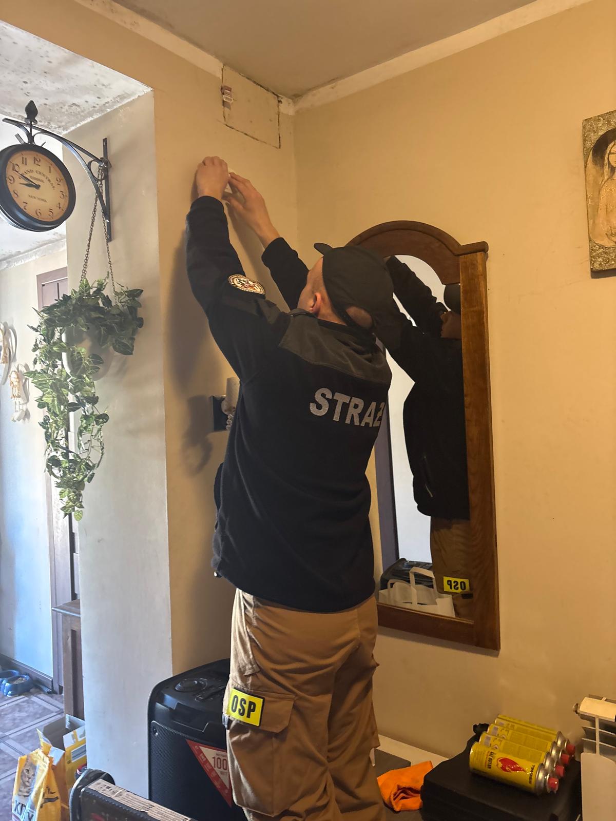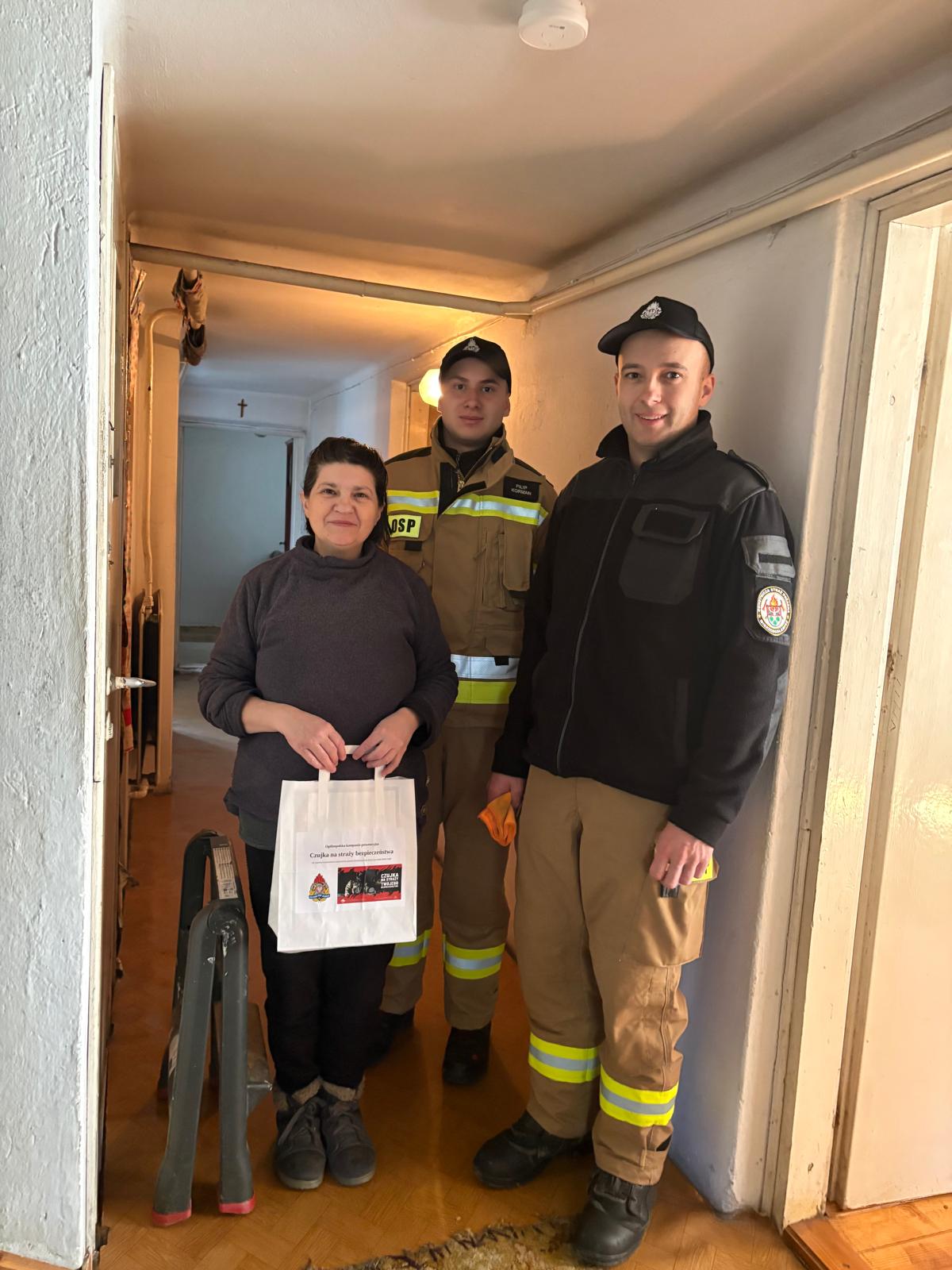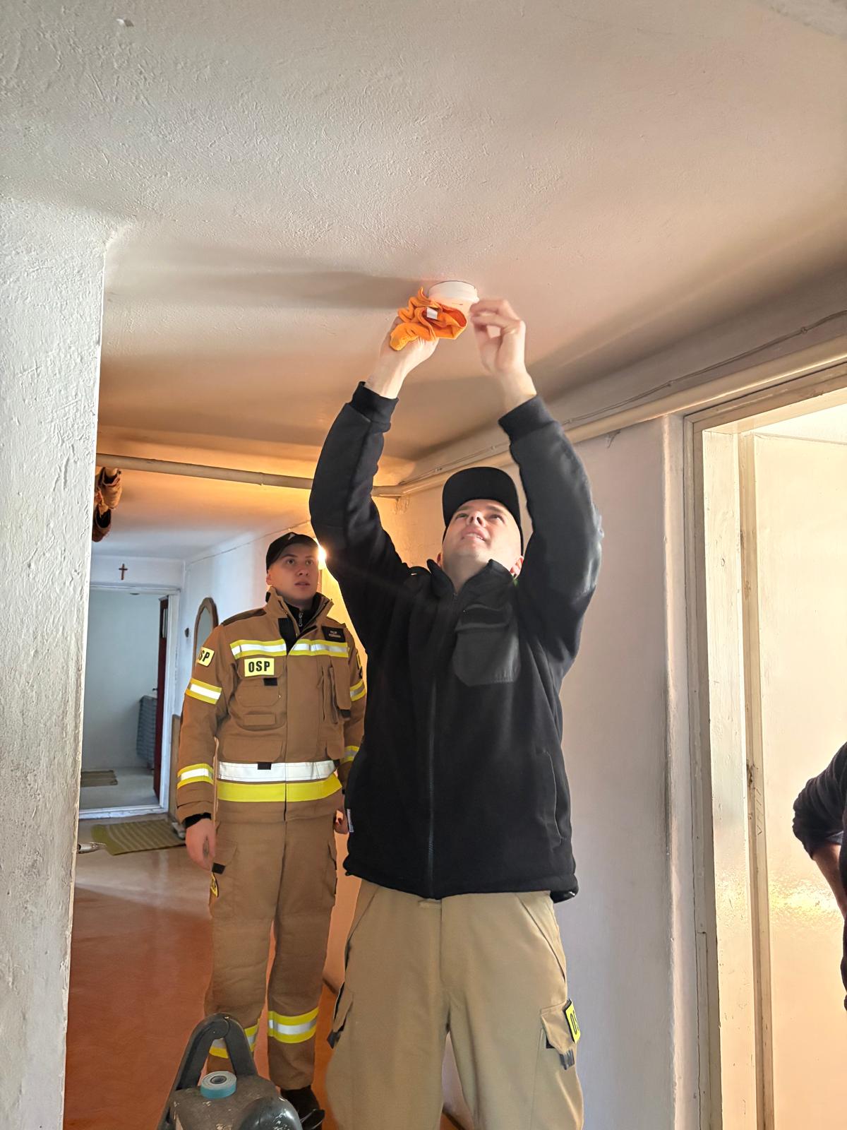 Dwóch strażaków i kobieta trzymająca w ręku torbę z napisem Czujka na straży bezpieczeństwaStrażak montujący czujkę dymu na ścianie pokojustażacy montują czujkę dymu na suficie pokoju