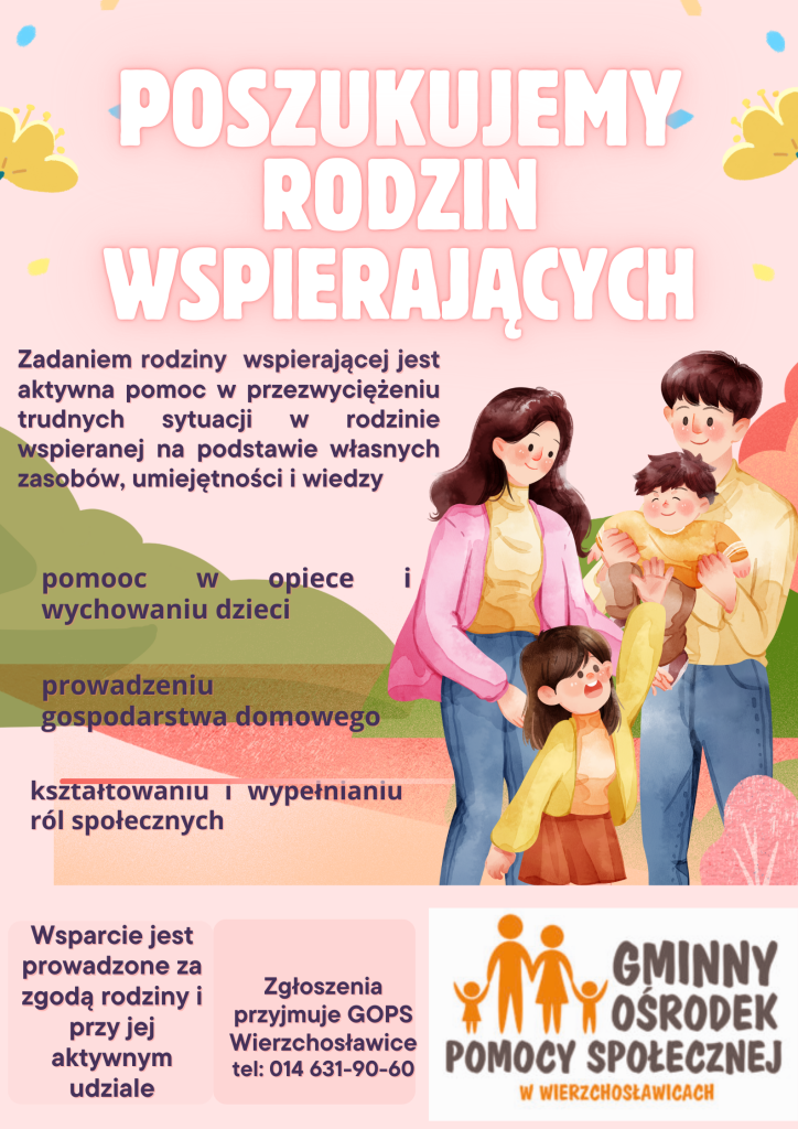 Osoby chętne do pełnienia funkcji rodziny wspierającej mogą zgłaszać swoją kandydaturę do Ośrodka Pomocy Społecznej w Wierzchosławicach.